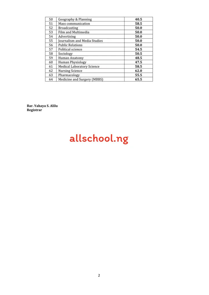 In a statement from the Admissions Office, candidates are advised to carefully note the minimum cut-off marks required for their chosen programmes as this will guide the admission process. According to the release, professional courses such as Law (66.5), Medicine and Surgery (65.5), Nursing Science (62.0), and Mass Communication (58.5) recorded some of the highest benchmarks this year.