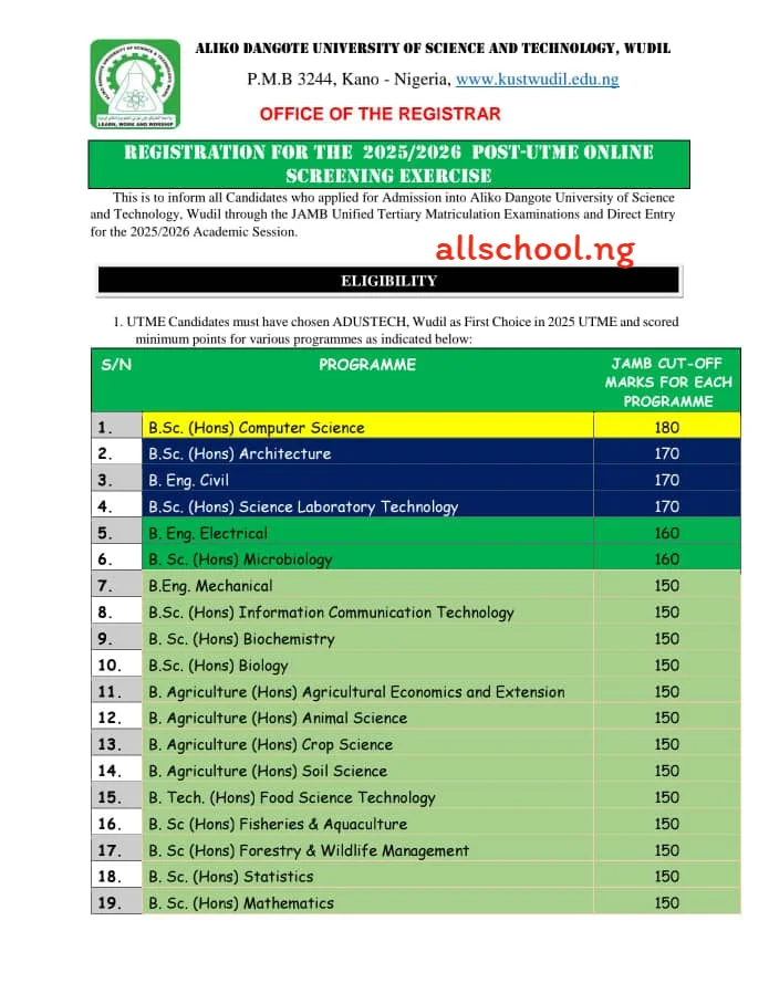Aliko Dangote University Of Science and Technology Wudil (ADUSTECH) formerly Kano University of Science and Technology (KUST) Post-UTME Form for 2025/2026 Academic Session is now on sale. The closing date is 31st August 2025. Form cost N2,000. Their cut-off mark is 150 — 180. See how to apply and other vital information below.