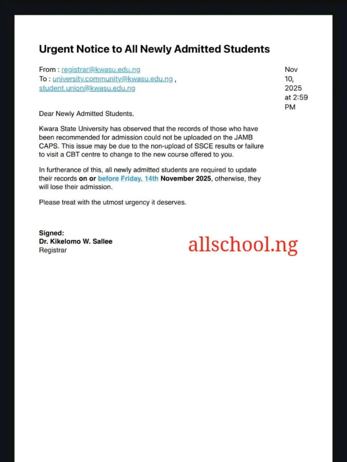 In furtherance of this, all newly admitted students are required to update their records on or before Friday, 14th November 2025, otherwise, they will lose their admission.