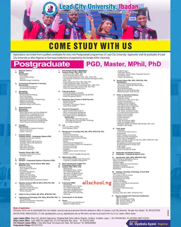 Applications are invited from suitably qualified candidates for admission into the various postgraduate programmes at Lead City University (LCU), Ibadan, Oyo State, for the 2024/2025 academic year.