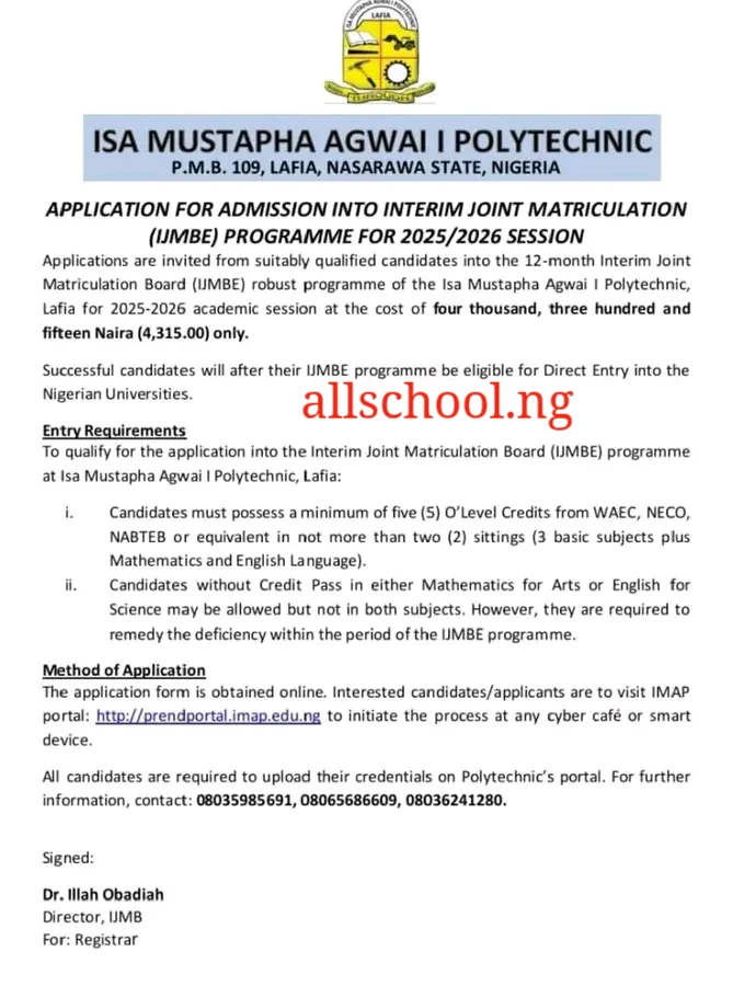 Applications are invited from suitably qualified candidates into the 12 months Interim Joint Matriculation Board (IJMB) rubost programme of the Isa Mustapha Agwai Polytechnic, Lafia for 2025/2026 Academic Session at the cost of N4,315.00 (Four Thousand Three Hundred and Fifteen Naira) only, Successful candidates will after their IJMB programme, be eligible for Direct Entry into the Nigerian Universities