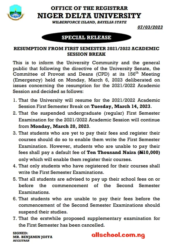 1. That the University will resume for the 2021/2022 Academic Session First Semester Break on Tuesday, March 14, 2023.
