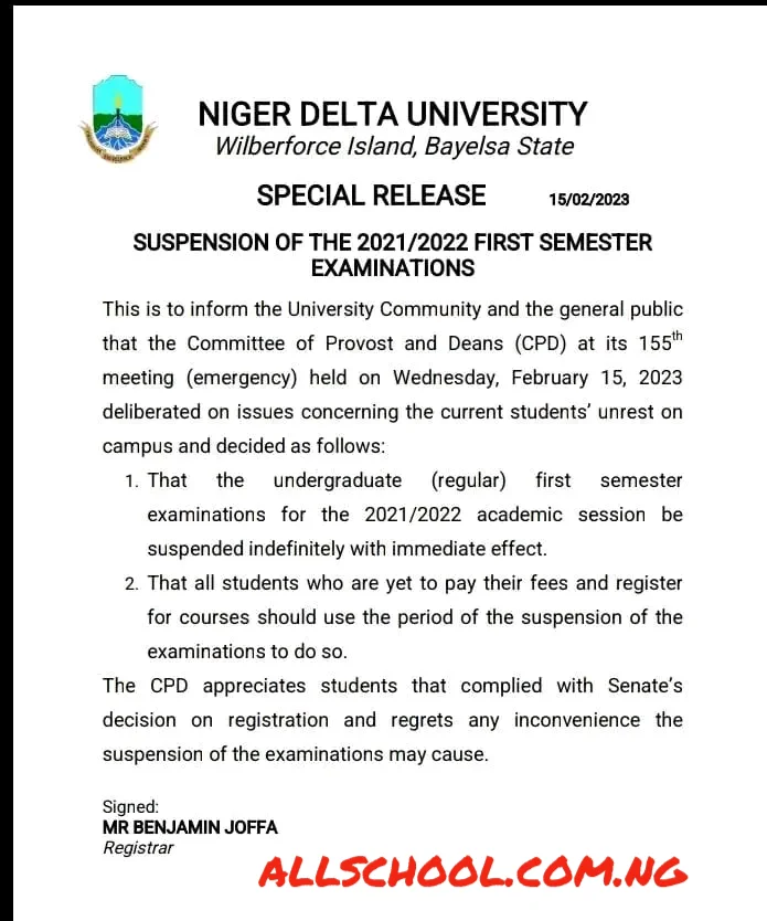Niger Delta University, NDU Suspends First Semester Examination For The 2021/2022 Academic Session.