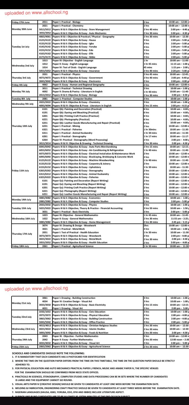 The actual dates and times for the subjects below will be determined by NECO. Your school will provide you with the details.