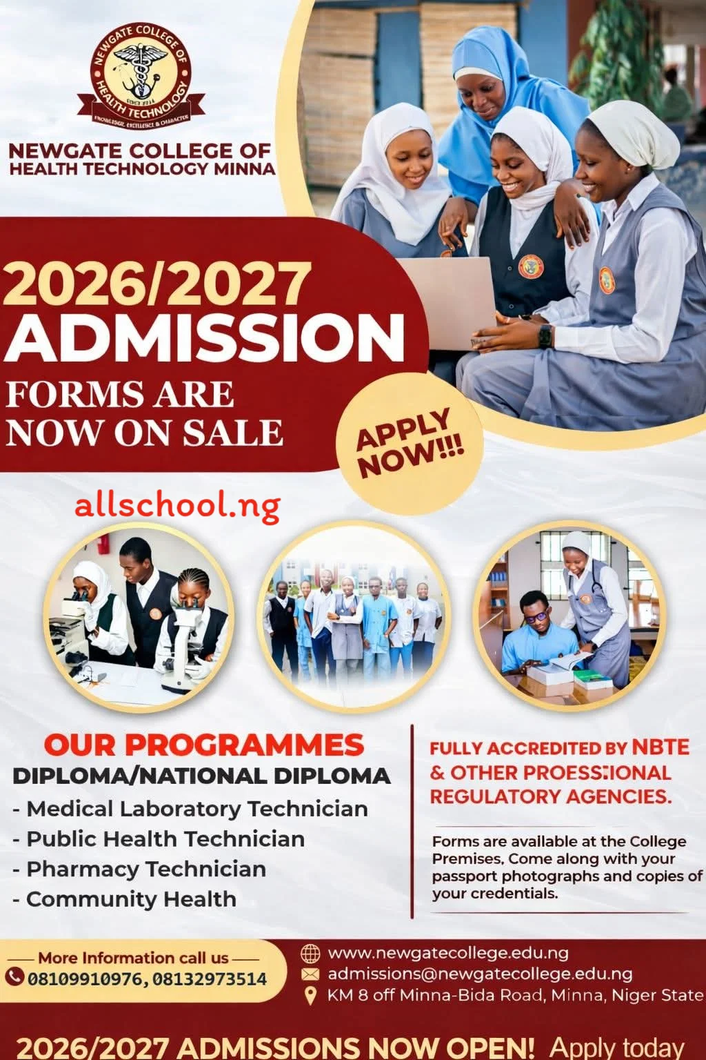 Newgate College of Health Technology, Minna Admission Form for 2026/2027 Academic Session is now on sale.