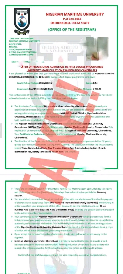 Nigeria Maritime University Disclaimer Notice on Fake Admission Letters.