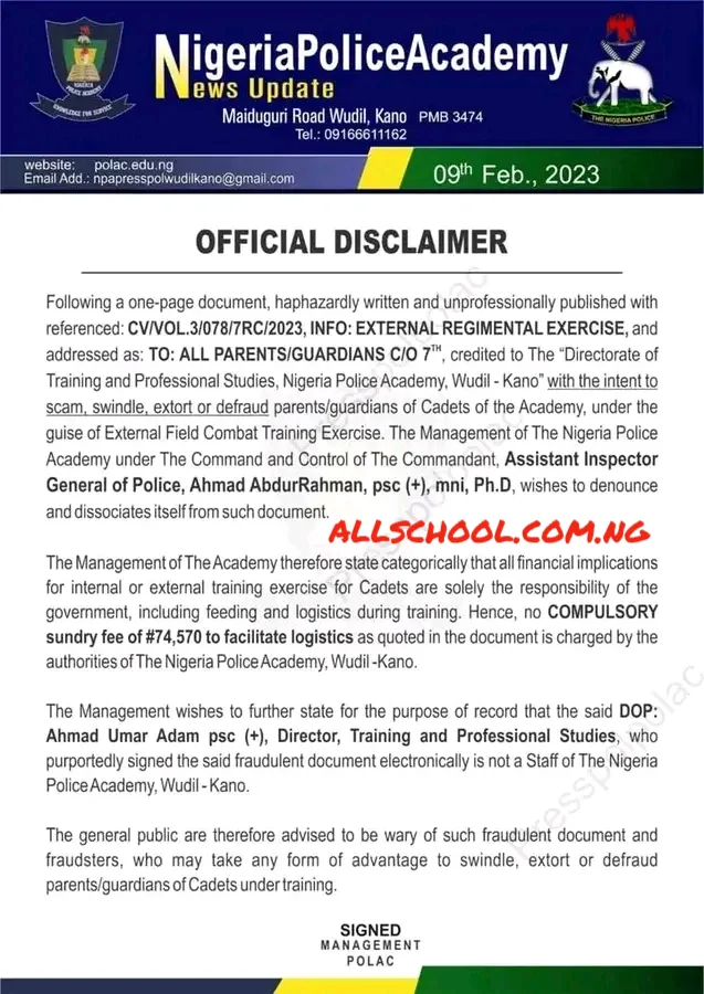 The Management of The Academy therefore state categorically that all financial implications for internal or external training exercise for Cadets are solely the responsibility of the govemment, including feeding and logistics during training. Hence, no COMPULSORY sundry fee of #74,570 to facilitate logistics as quoted in the document is charged by the authorities of The Nigeria Police Academy, Wudil-Kano.