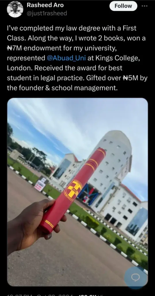 “I completed my law degree with a First Class. Along the way, I authored two books that generated ₦7 million in endowment for my university, represented @Abuad_Uni at King’s College, London, and received over ₦5 million from the founder and management as the top student in legal practice,” he wrote.