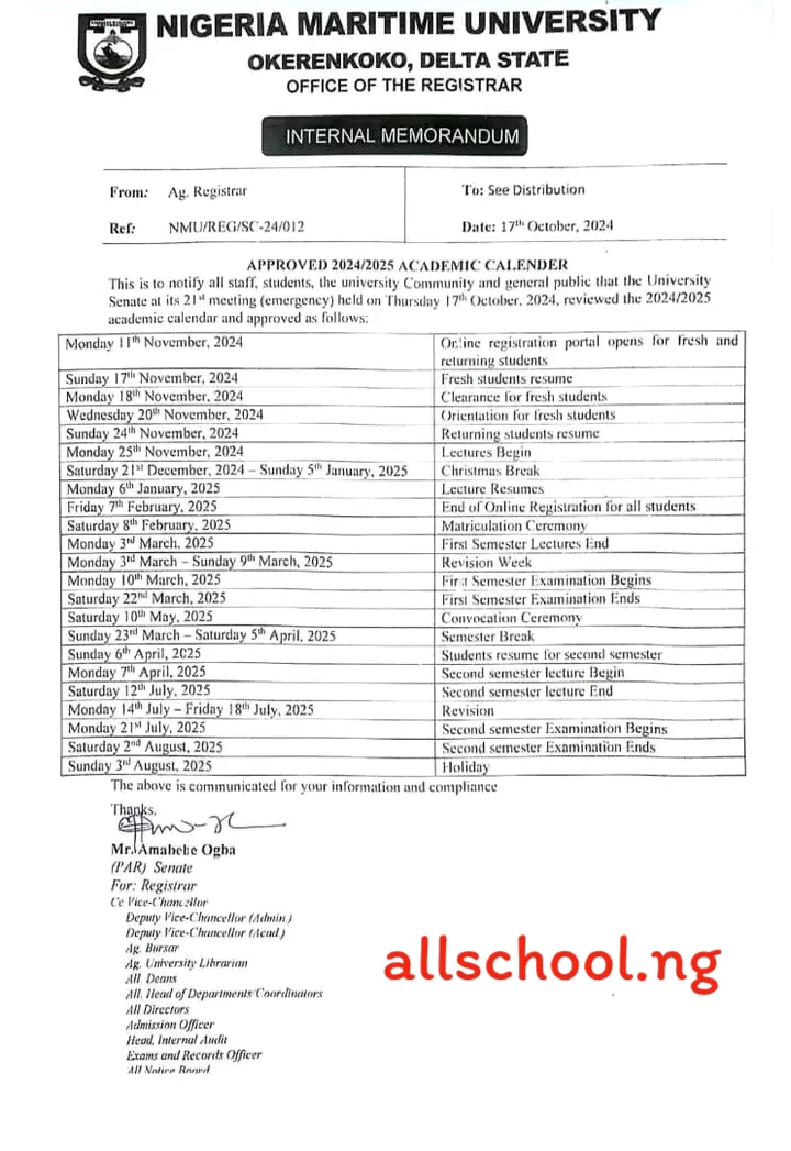 Nigerian Maritime University (NMU) Official Academic Calendar for the 2024/2025 Academic session has been released. See the details below.