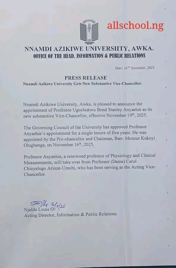 Nnamdi Azikiwe University, Awka, is pleased to announce the appointment of Professor Ugochukwu Bond Stanley Anyachie as its new substantive Vice-Chancellor, effective November 19th, 2025.