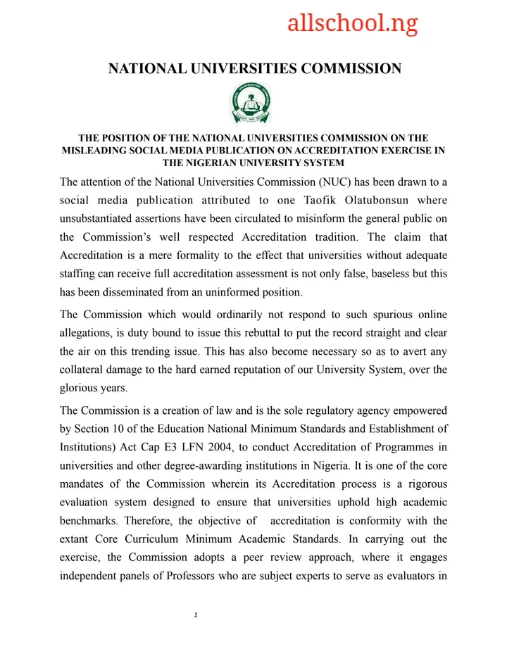 The attention of the National Universities Commission (NUC) has been drawn to a social media publication attributed to one Taofik Olatubonsun where unsubstantiated assertions have been circulated to misinform the general public on the Commission’s well respected Accreditation tradition. The claim that Accreditation is a mere formality to the effect that universities without adequate staffing can receive full accreditation assessment is not only false, baseless but this has been disseminated from an uninformed position.