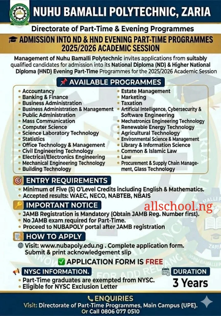 The Management of Nuhu Bamalli Polytechnic invites applications from suitably qualified candidates for admission into its National Diploma (ND) & Higher National Diploma (HND) Evening Part-Time Programmes for the 2025/2026 Academic Session.