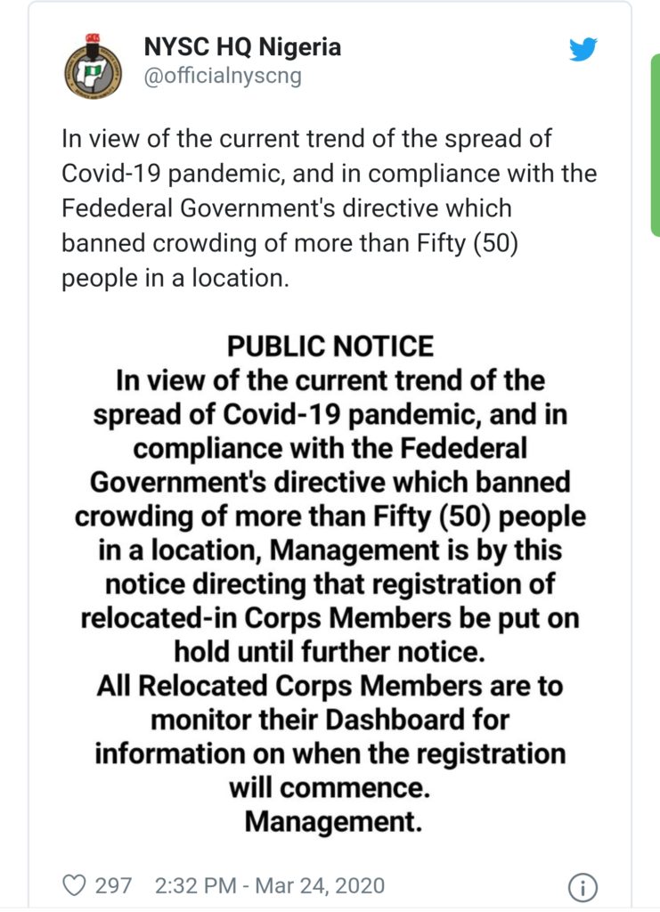 “Management is by this notice directing that registration of relocated-in Corps Members be put on hold until further notice,” NYSC tweeted.