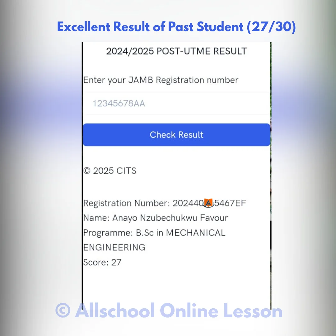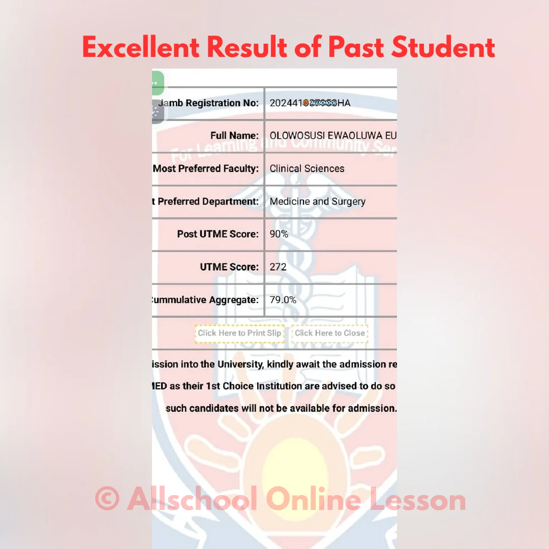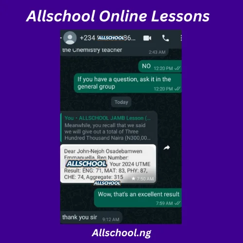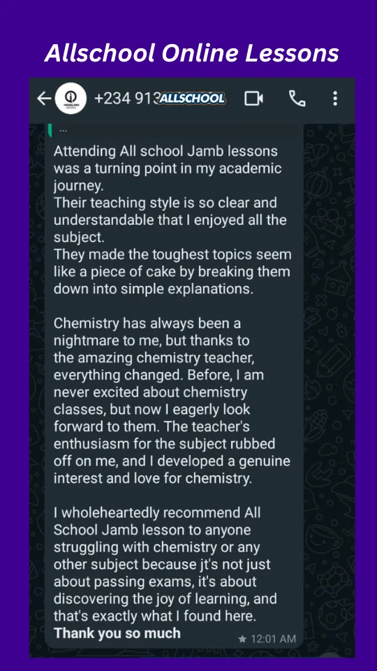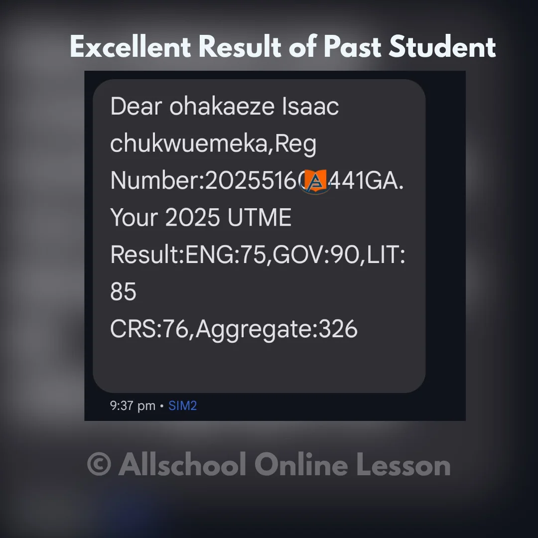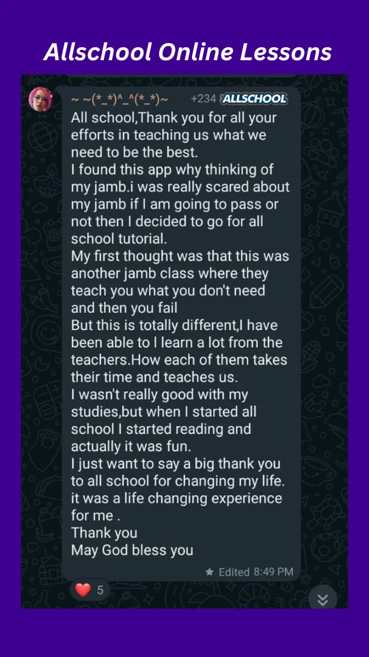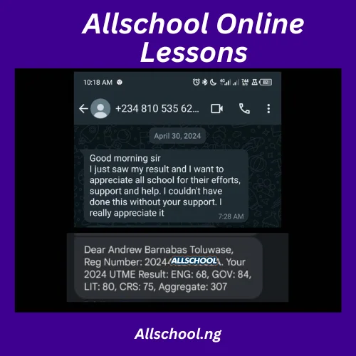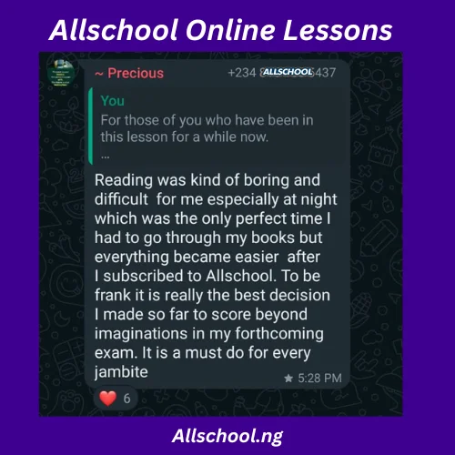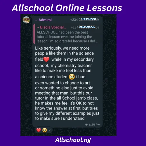 I'm so happy I joined the All school JAMB lesson I mean the lesson has been of great help to me. All school JAMB lesson has been the best and I want to say a very big thank you to our tutors