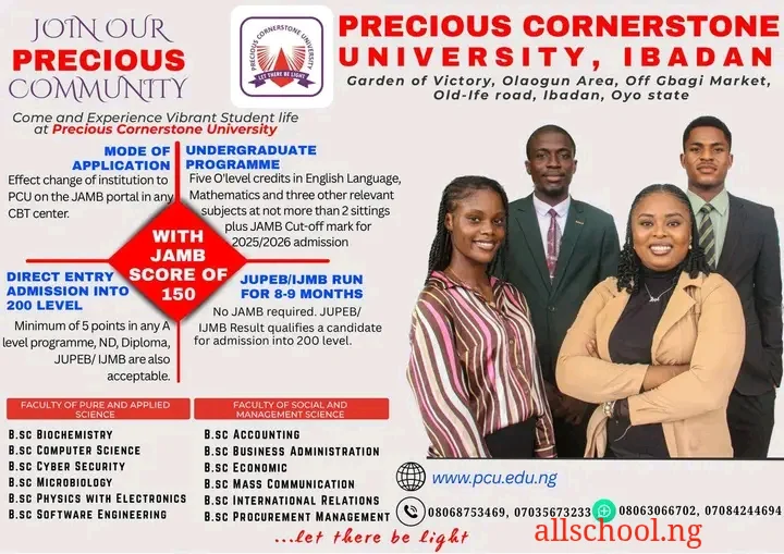 - Candidates seeking undergraduate admission into Precious Cornerstone University (PCU), Ibadan as their University of Choice including Direct Entry candidates, those seeking admission via change of institution and transfer, are formally invited to attend the 2025/2026 screening exercise.