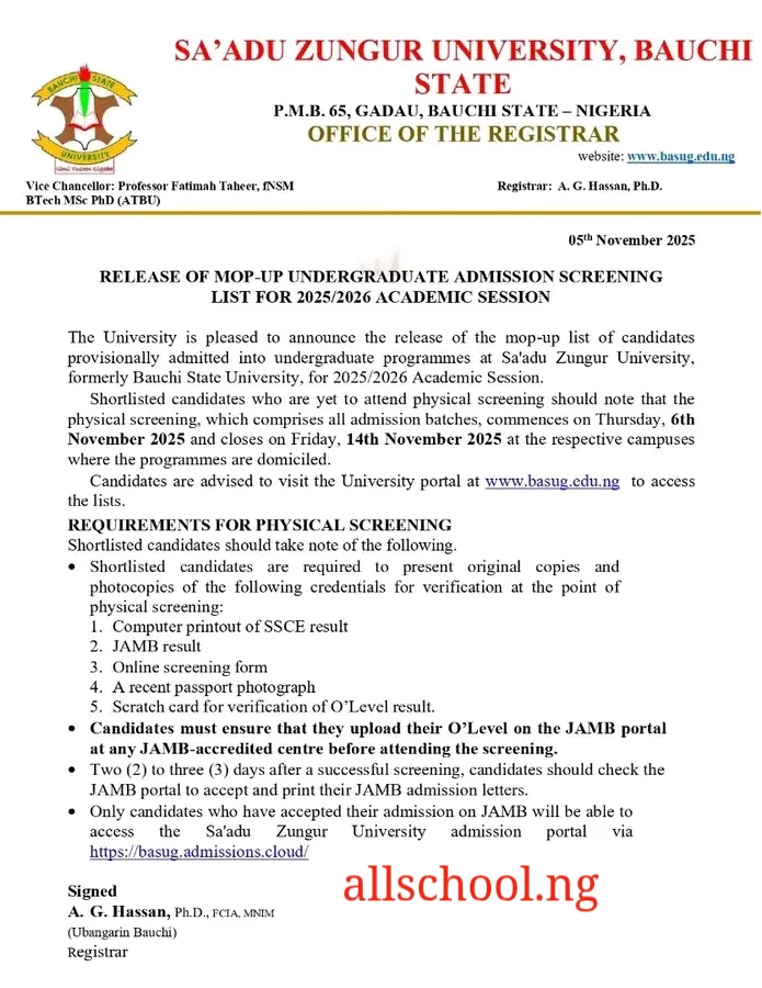 The University is pleased to announce the release of the mop-up list of candidates provisionally admitted into undergraduate programmes at Sa’adu Zungur University, formerly Bauchi State University, for 2025/2026 Academic Session.