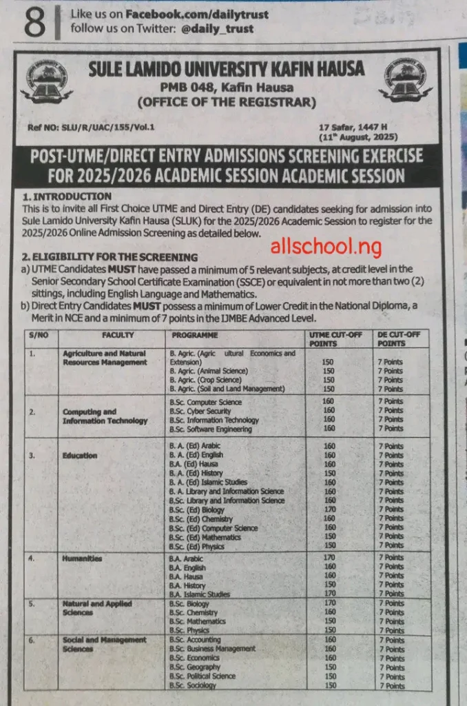 SLU Cut-Off Mark 2025: This page will show you everything you need to know about the Sule Lamido University (SLU) Cut-off mark for the 2025/2026 academic session.