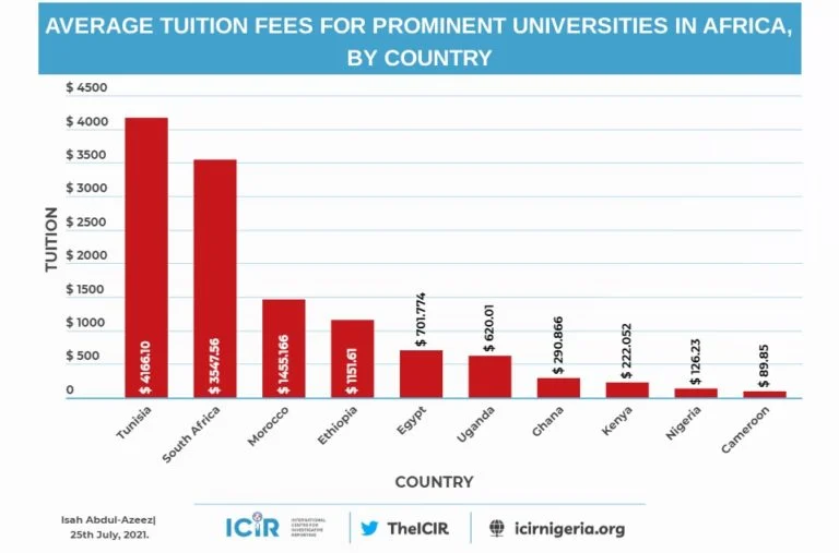Tunisia ranked the costliest, with an average tuition value of $4,166, followed by South Africa, whose universities charged an average of $3,548.