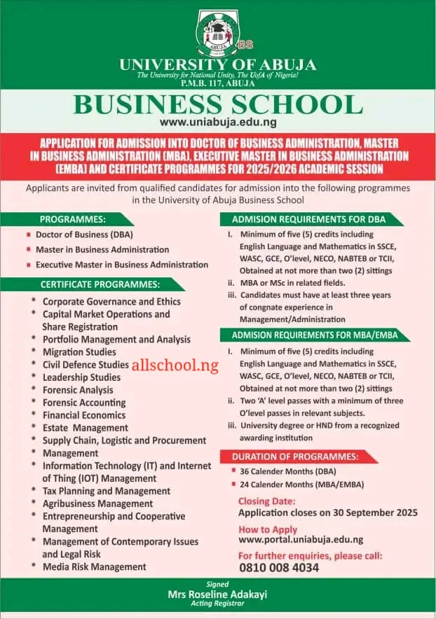 University of Abuja (UNIABUJA) Business School MBA Form for the 2025/2026 Academic Session is now on sale.. Registration Closes On 30th September 2025.