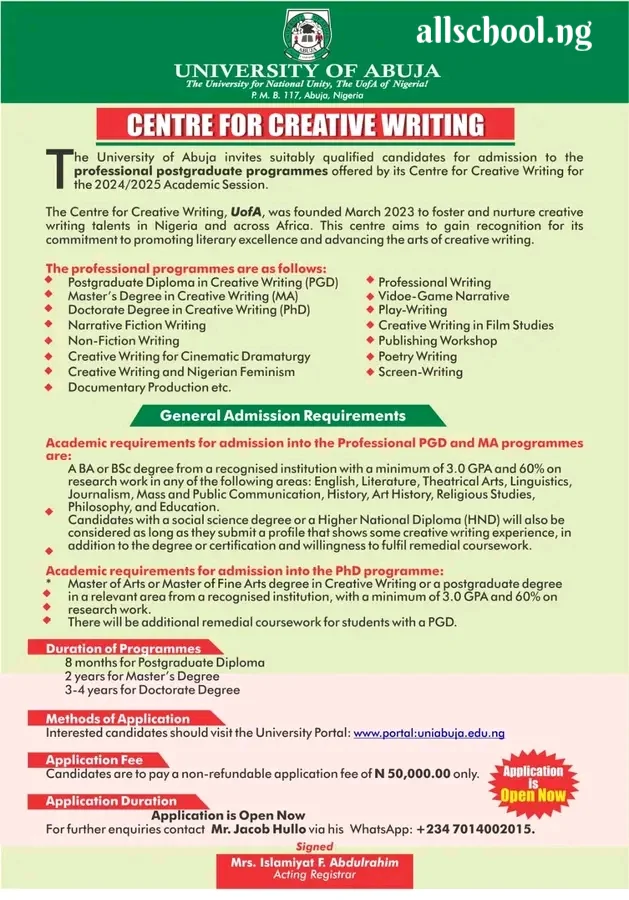 The University of Abuja invites suitably qualified candidates for admission to the professional postgraduate programmes offered by its Centre for Creative Writing for the 2024/2025 Academic Session.