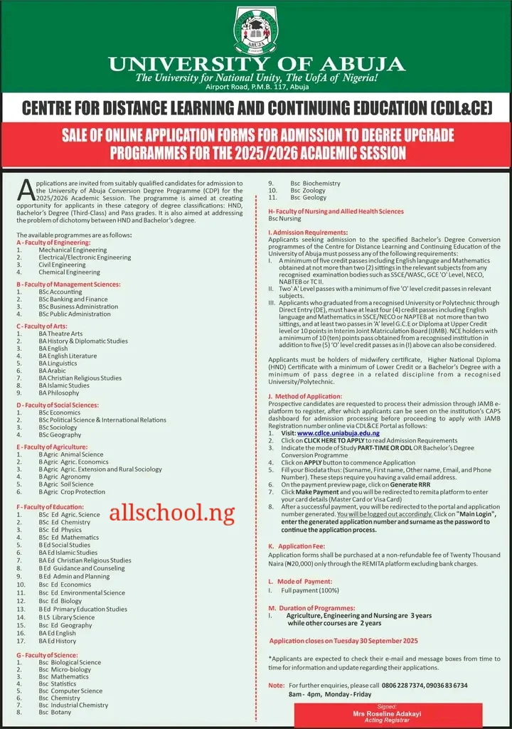 UNIABUJA Sandwich/Part-Time Admission form for 2026/2027 Contact is Out. The form cost NGN20,000. Registration Closes Tuesday 30 September 2025.