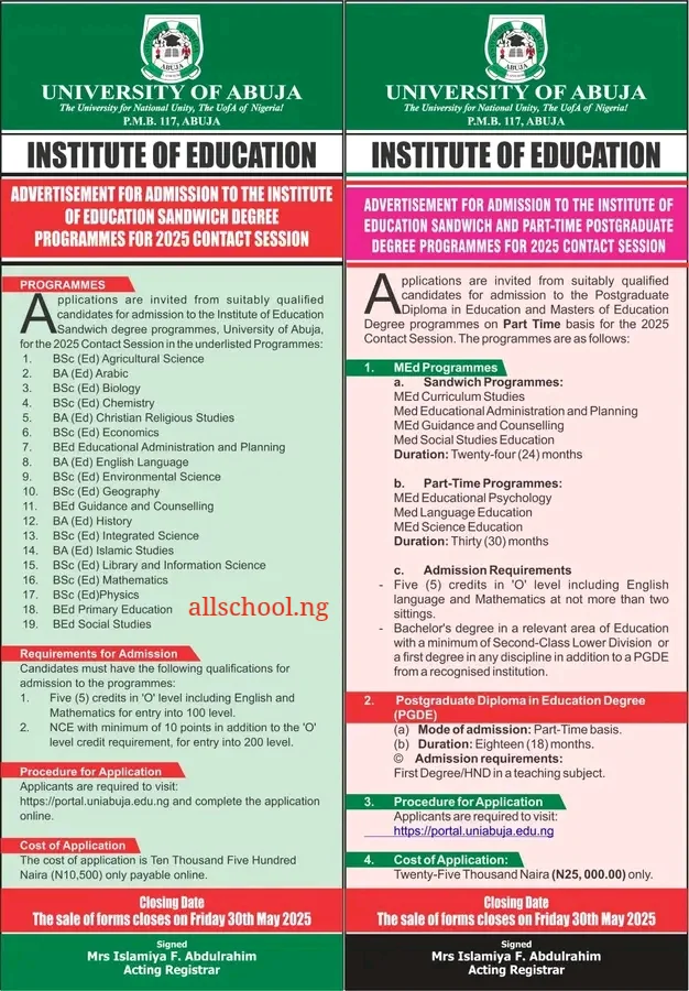 University Of Abuja, UNIABUJA Sandwich/Part-time Postgraduate Degree Admission Form For 2025 is still On Sale. Registration Closes On Friday 30th May 2025. The Form Cost N25,000.