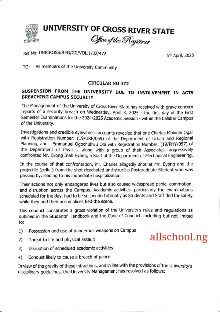 The management of University of Cross River State, UNICROSS has Suspended some Students Over Campus Shooting Incident