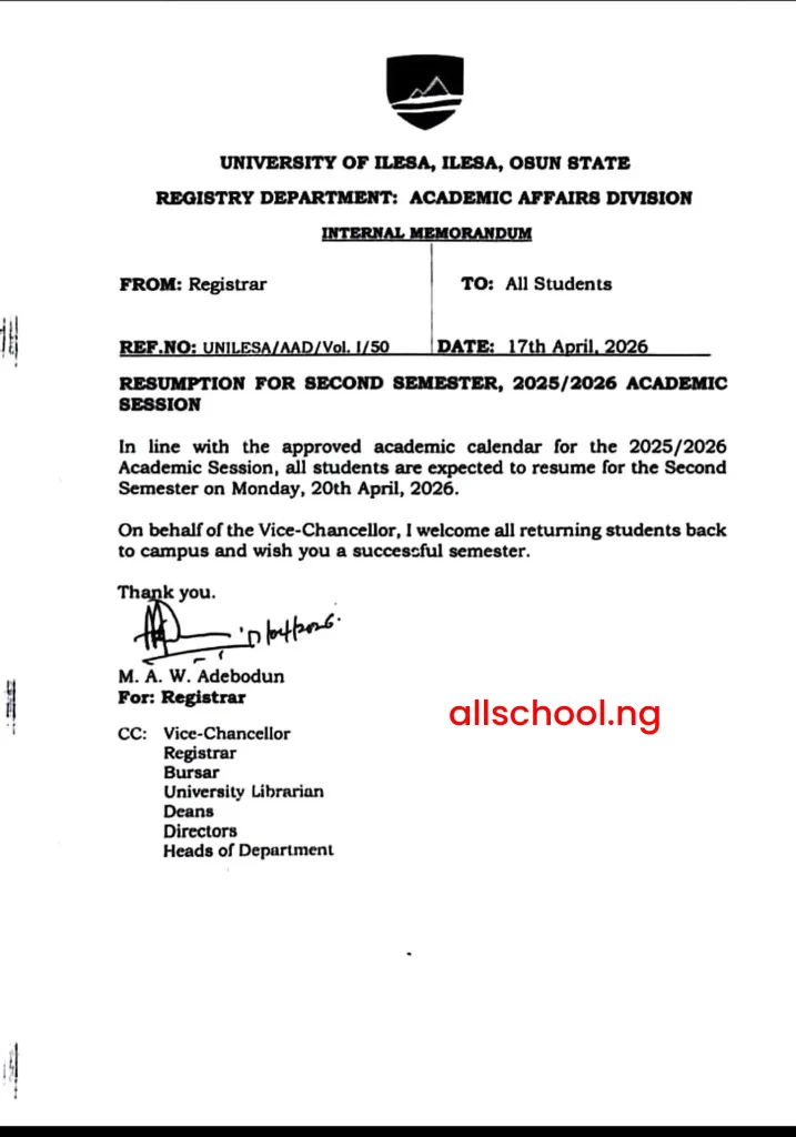 The University of Ilesa has officially directed all students to resume for the second semester of the 2025/2026 academic session on Monday, 20th April, 2026.