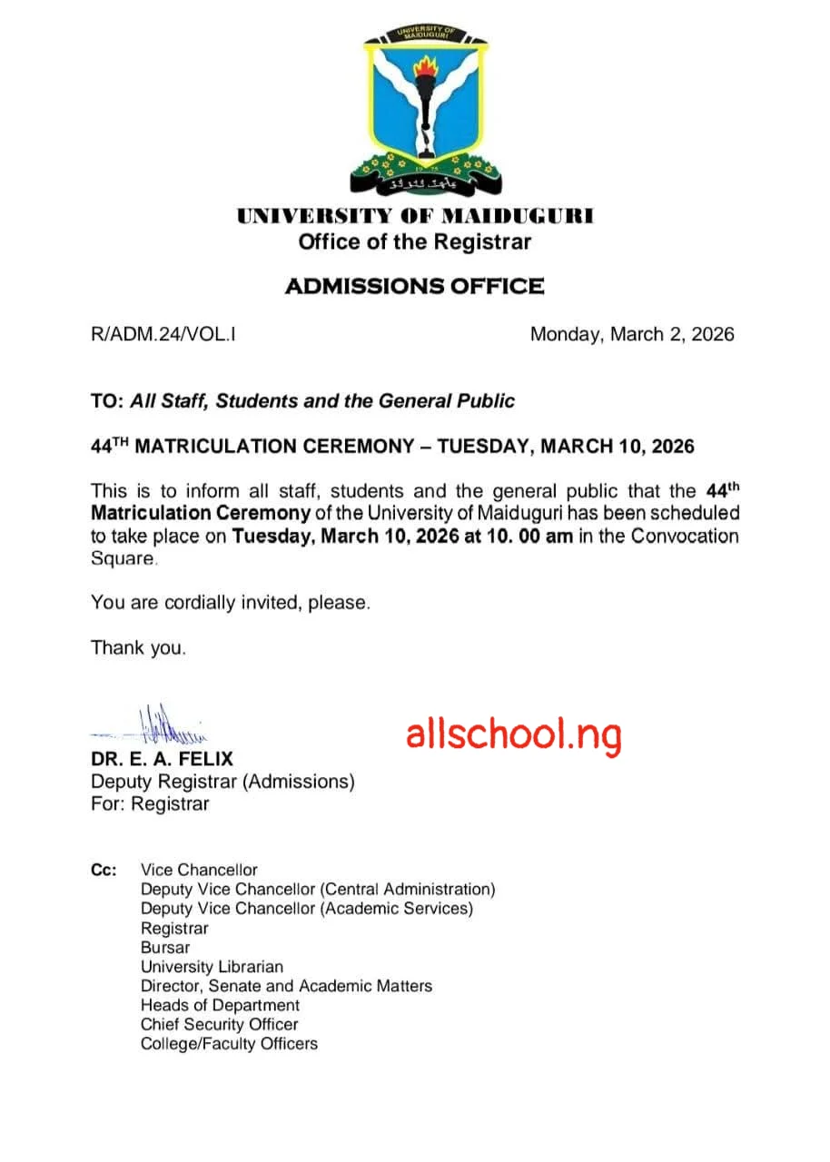 This is to inform all staff, students and the general public that the 44th Matriculation Ceremony of the University of Maiduguri has been scheduled to take place on Tuesday, March 10, 2026 at 10.00 am in the Convocation Square.