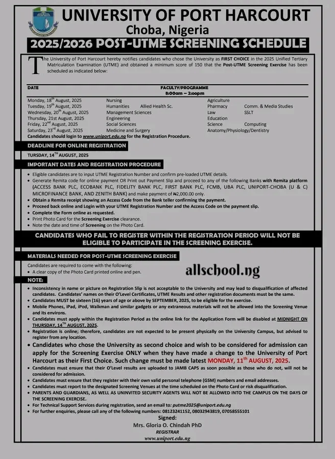 The University of Port Harcourt hereby notifies candidates who chose the University as FIRST CHOICE in the 2025 Unified Tertiary Matriculation Examination (UTME) and obtained a minimum score of 150 that the Post-UTME Screening Exercise has been scheduled as indicated below:
