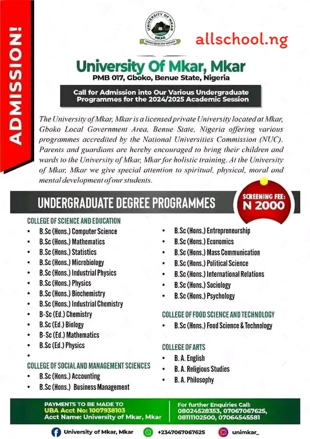 This is to notify candidates who sat for the 2024 JAMB UTME and scored a minimum of 140 and are willing to enroll into full-time undergraduate Programmes at University of Mkar, Mkar, that, admission into the University for the 2024/2025 academic session is in progress.