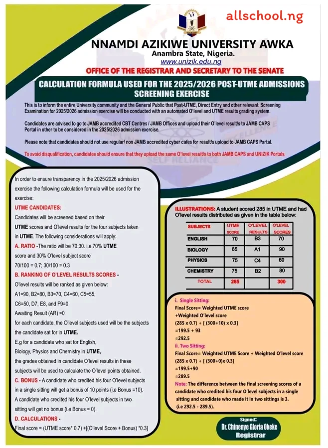 Nnamdi Azikiwe University Awka UNIZIK Calculation Formula Used For The 2025/2026 Post-Utme Admissions Screening Exercise