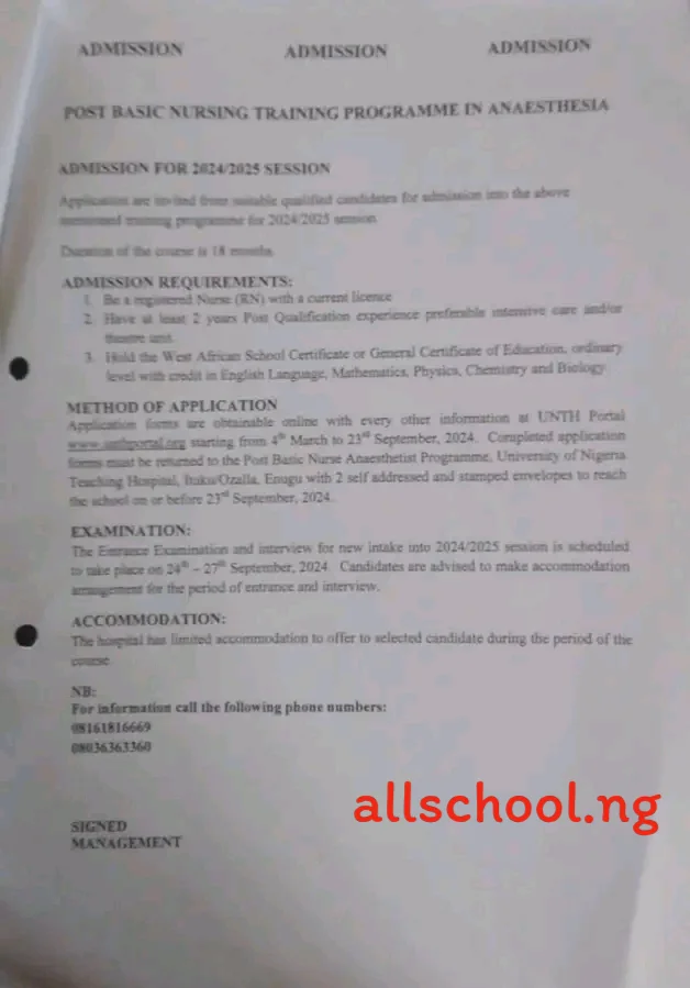 - Completed application forms must be returned to the Post Basic Nurse Anaesthetist Programme, University of Nigeria Teaching Hospital, Itukul/Ozalla, Enugu with 2 self-addressed and stamped envelopes to reach the school on or before 3rd September 2024.