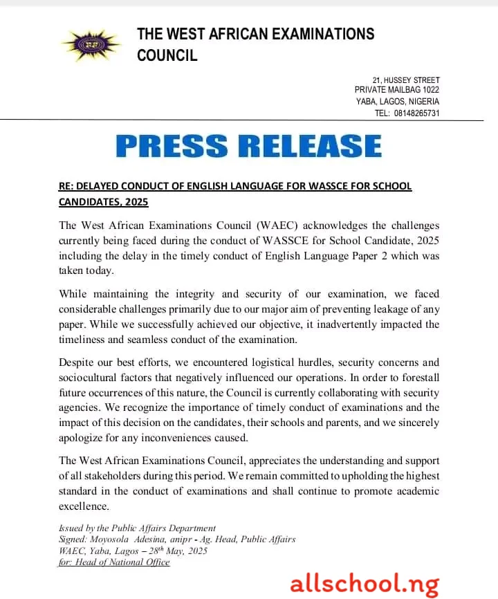 The West African Examinations Council (WAEC) acknowledges the challenges currently being faced during the conduct of WASSCE for School Candidates, 2025, including the delay in the timely conduct of English Language Paper 2, which was taken today.