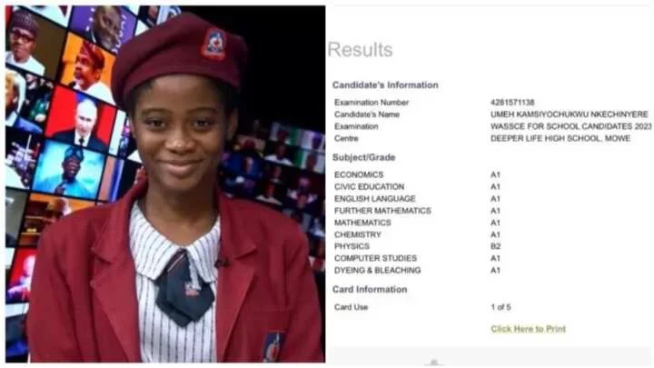 Umeh, a student of Deeper Life High School who was recently celebrated for scoring 360 in the Unified Tertiary Matriculation Examination (UTME) has again displayed academic excellence in her WAEC result.