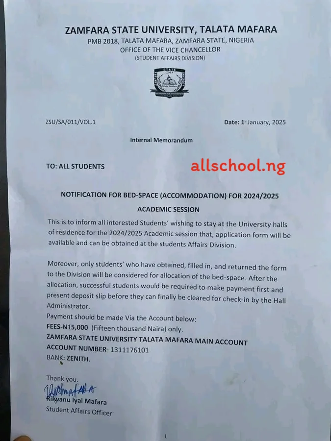 Zamfara State University Talata Mafara, ZAMSUT Notification For Bed-space (Accommodation) For 2024/2025 Academic Session.